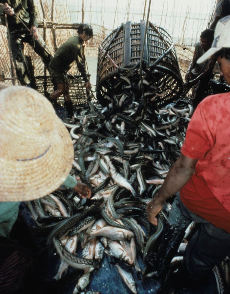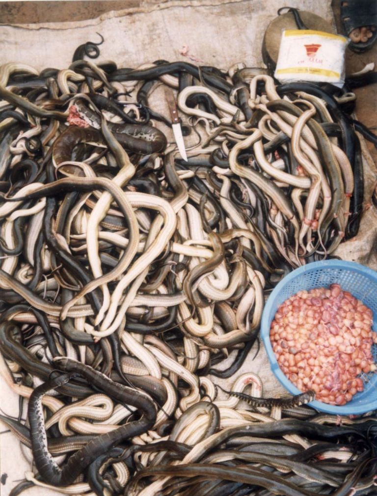 This cyclic flooding creates a genuine vegetal broil, which forms the basis of the extraordinary biological productivity of the lake. The Tonle Sap is one of the world's top freshwater fisheries (300,000 tons annual catch). It also shelters the most important waterbird colonies of the region and supports the world's largest snake harvest (five million individuals per year!) -- mostly to be given as snacks for farm crocodiles. Three million Cambodians are directly dependent upon the lake's resources, as fish provide 70 percent of their protein intake.