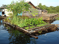 Potagers flottants Un savoir-faire local de potager sur des radeaux de bambous a inspiré notre première intervention de développement. 54 familles ont reçues le matériel initial (bambou, sacs, bois) pour construire leur propre potager et les semences de départ. Les potagers hébergent jusqu’à 30 variétés de plantes : des herbes aromatiques, des légumes, et même certains fruits (papayes, bananes). Ils améliorent l’alimentation, rendent les familles moins dépendantes des ressources forestières, |
