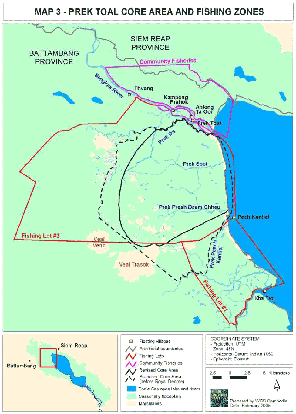 La forêt inondée de Prek Toal a été désignée comme aire centrale (21,000 ha) de la Réserve de Biosphère du Tonlé Sap en raison de sa diversité botanique et des colonies d'oiseaux menacés qui y nichent. L'aire protégée est en théorie gérée en vue de la conservation de la biodiversité mais dans les faits, elle a été intensivement exploitée comme concession de pêche jusqu'en 2011. Le Lot de pêche couvrait pas moins de 50,000 ha et était le plus productif et lucratif du lac, avec une valeur annuelle en poissons évaluée à 3 millions de dollars US ! Cependant, l'abolition récente des Lots de pêche par le Premier Ministre Hun Sen est un nouveau défi à relever pour assurer la protection de la forêt inondée et des colonies d'oiseaux.